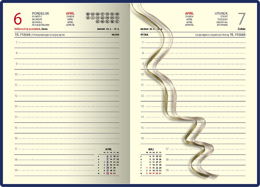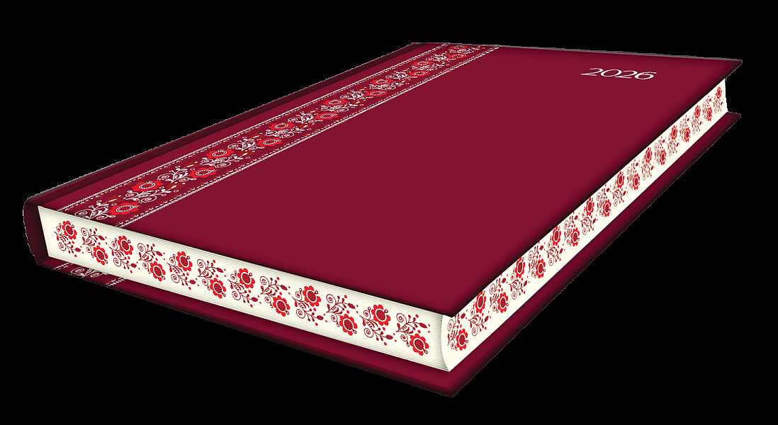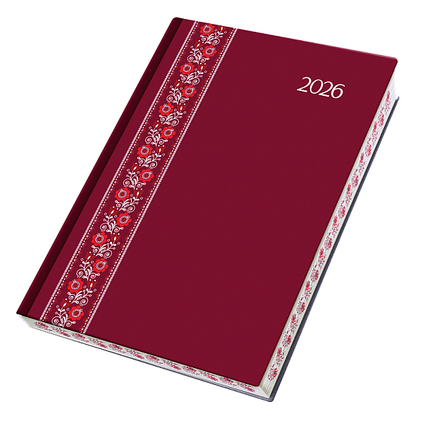 Obľúbený denný diár má oderuvzdorný povrch s motívom folklórnej stuhy. Efektná razba fóliou a 3D lak vytvárajú dokonalý dizajn. Jediný svojho druhu na trhu. Obsahuje slovenské kalendárium. Bočné plochy diára sú potlačené farebným motívom.