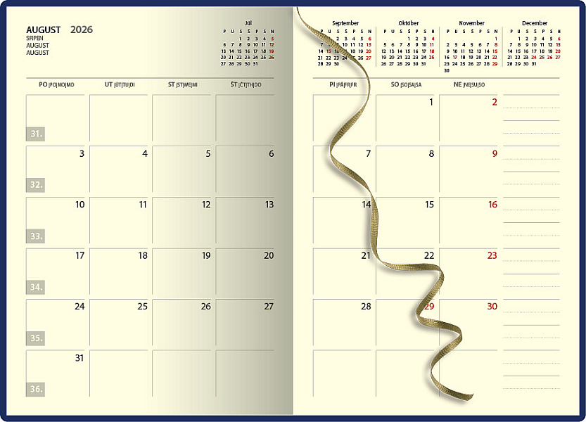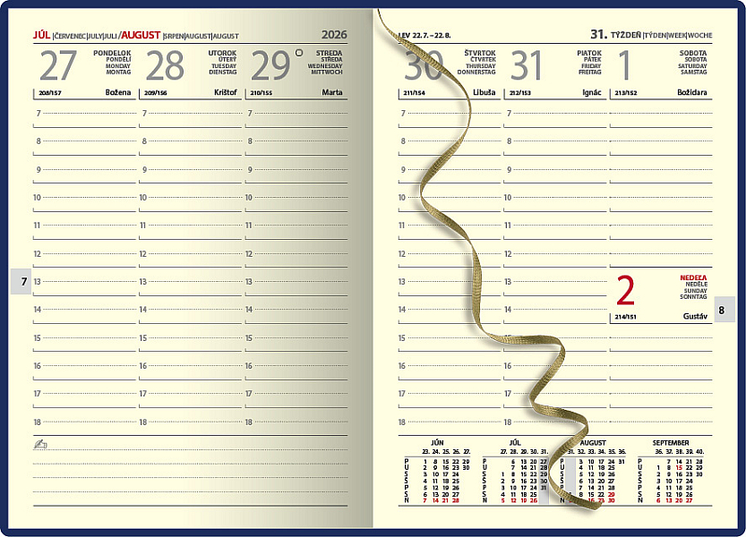 Obľúbený týždenný diár s prehľadným kalendáriom na celý týždeň. Diár je v pevnej väzbe s prednou penou so slovenským kalendáriom. Jednoduchý dizajn dopĺňa strieborná razba roku.