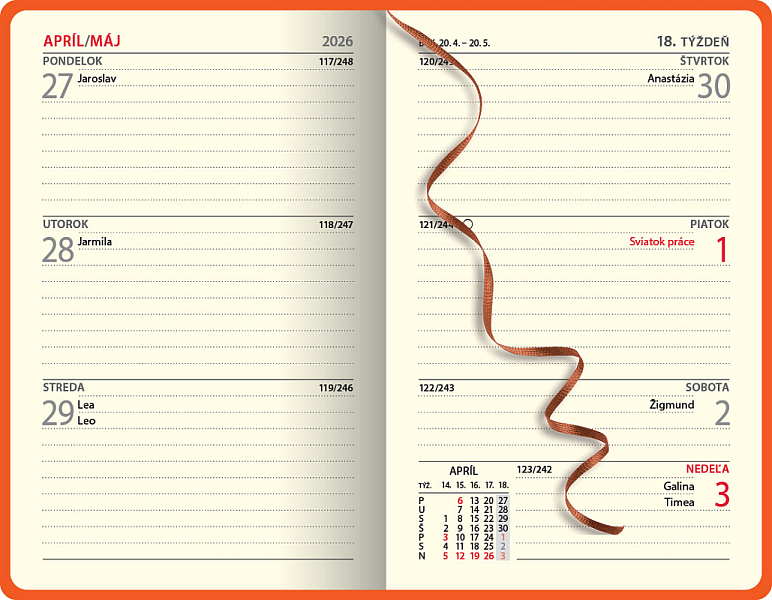 Štýlový týždenný mini diár v pestrej farbe s prehľadným kalendáriom na celý týždeň. Diár má praktickú flexi väzbu. Stredom diára je gumička prichytená o kovový úchyt. Obsahuje slovenské kalendárium.