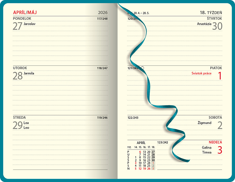 Jedinečný týždenný mini diár v krásnej tyrkysovej farbe potiahnutý kvalitným termocitlivým poťahom. Diár je v pevnej väzbe s prednou penovou doskou, farebnou gumičkou. Slovenské kalendárium.