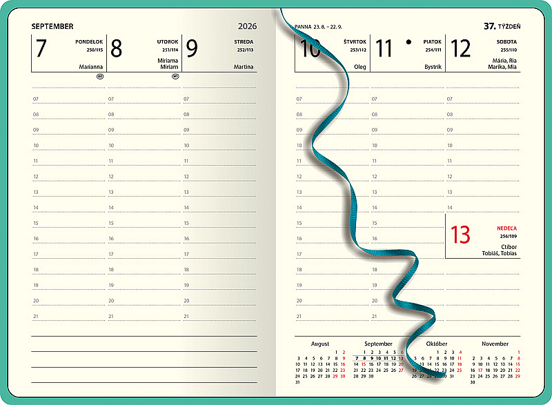 Jedinečný týždenný diár potiahnutý kvalitným termocitlivým poťahom. Diár je v pevnej väzbe s prednou penovou doskou, farebnou gumičkou, pútkom na pero a praktickým vreckom. Slovenské prehľadné kalendárium.