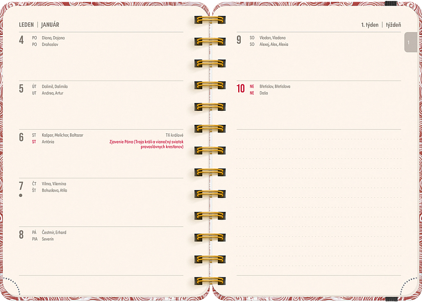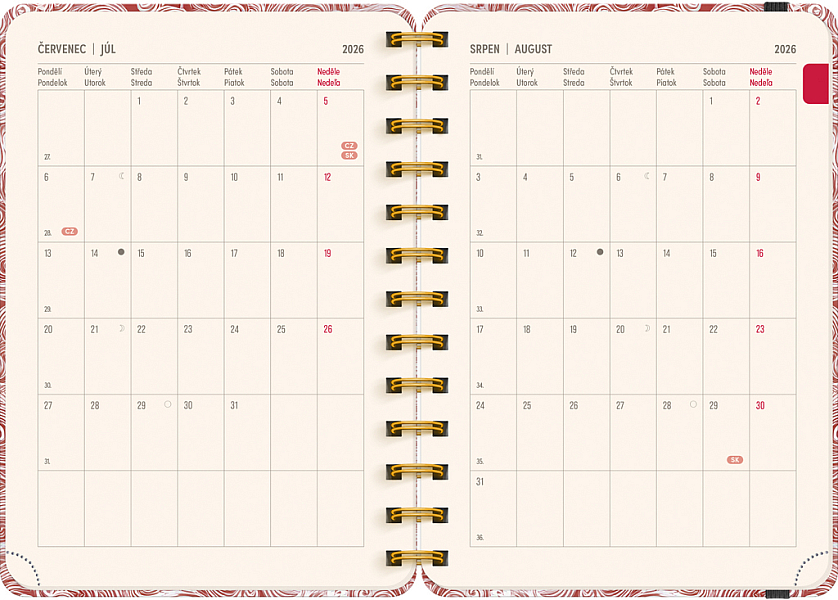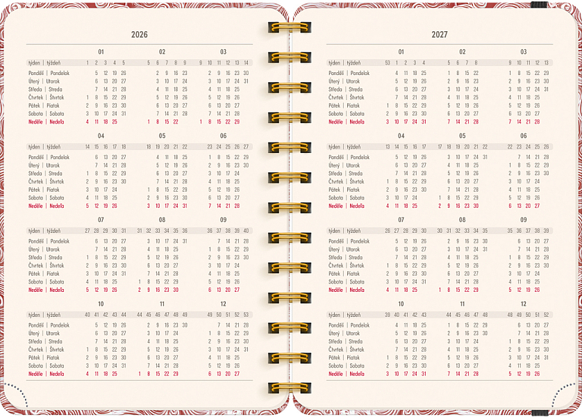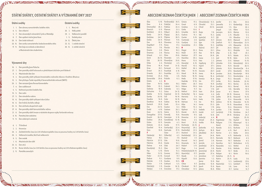 Osemnásťmesačný diár obsahuje prehľad na roky 2026 a 2027, zoznam českých a slovenských mien, česko-slovenský týždenný riadkový kalendár s menami a sviatkami a priestor na poznámky v každom týždni. Kalendár začína v júli 2026 a končí v decembri 2027.