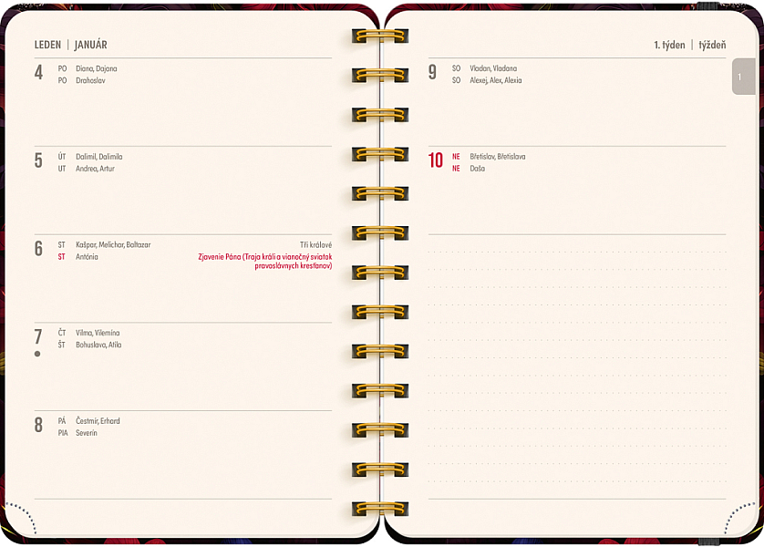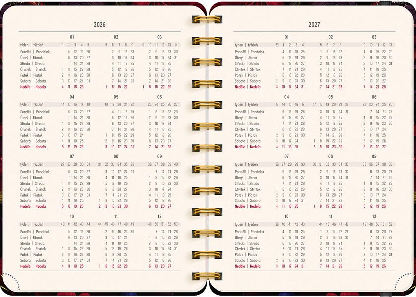 Osemnásťmesačný diár obsahuje prehľad na roky 2026 a 2027, zoznam českých a slovenských mien, česko-slovenský týždenný riadkový kalendár s menami a sviatkami a priestor na poznámky v každom týždni. Kalendár začína v júli 2026 a končí v decembri 2027.