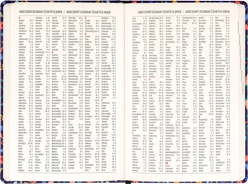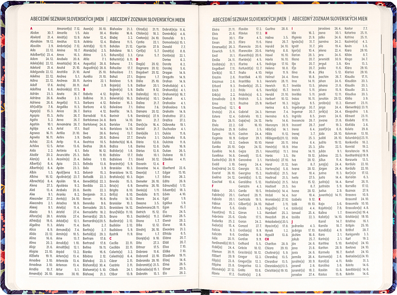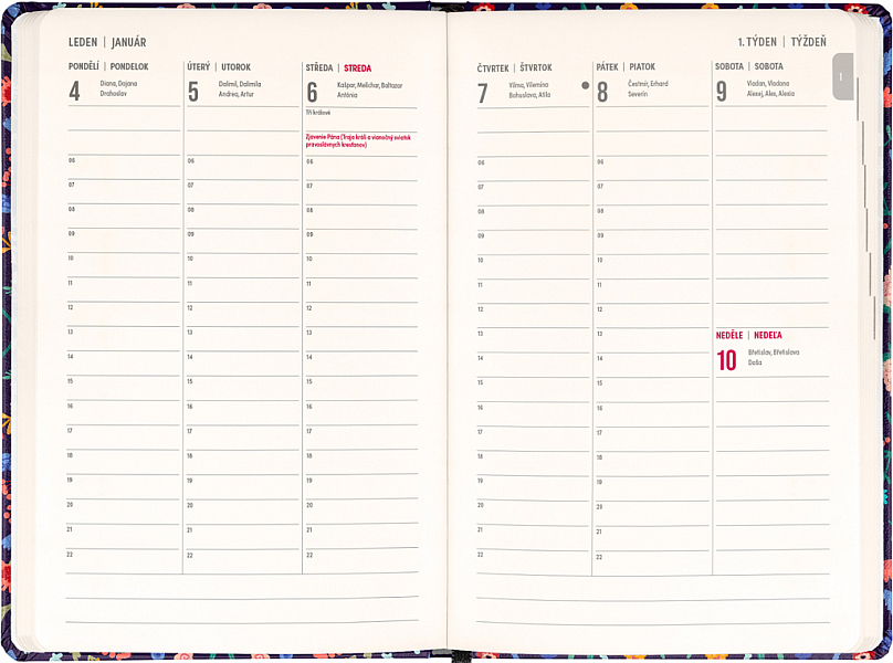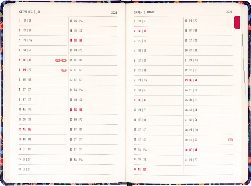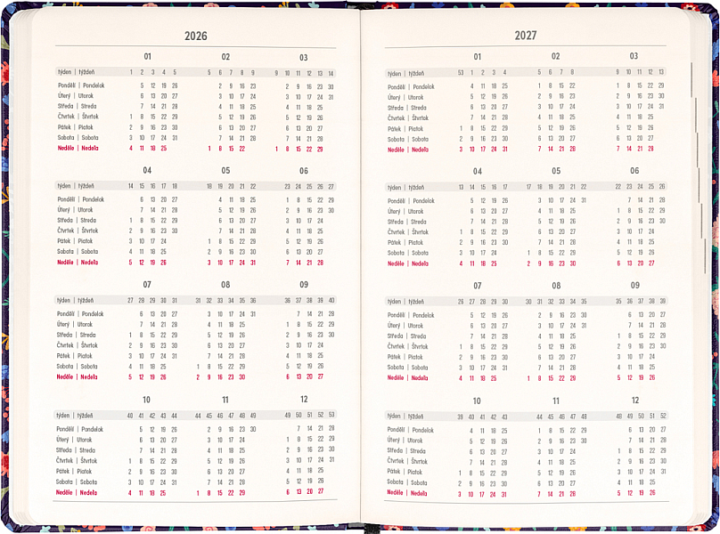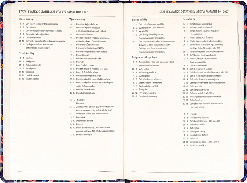 Osemnásťmesačný diár obsahuje prehľad na roky 2026 a 2027, zoznam českých a slovenských mien a česko-slovenský týždenný stĺpcový kalendár s menami a sviatkami. Kalendár začína v júli 2026 a končí v decembri 2027.